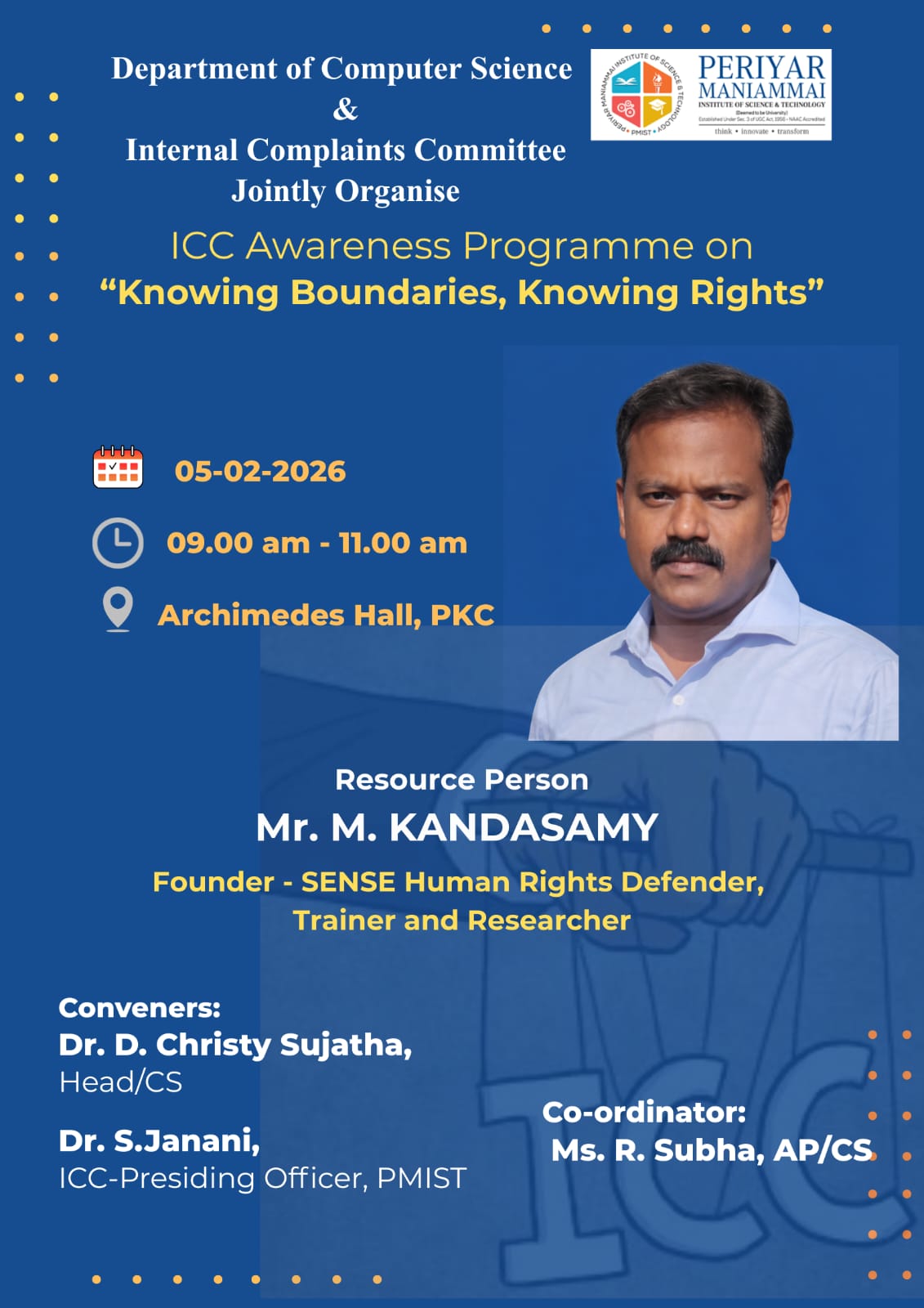 Department of Computer Science & Internal Complaints Committee Jointly Organise PERIYAR ΜΑΝΙΑΜΜΑΙ ICC Awareness Programme on "Knowing Boundaries, Knowing Rights"