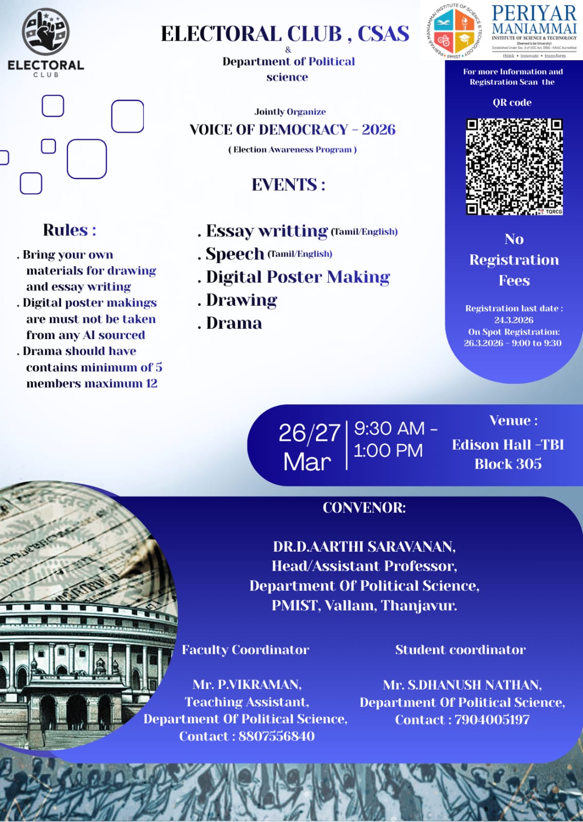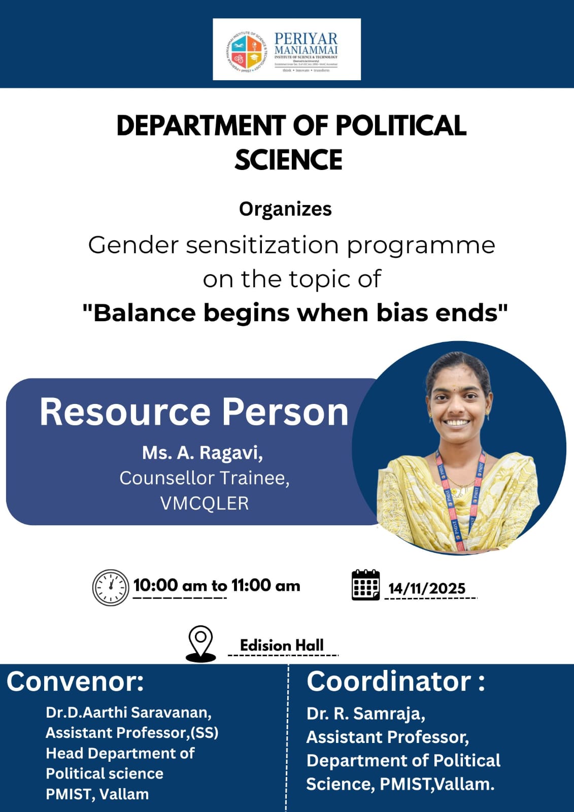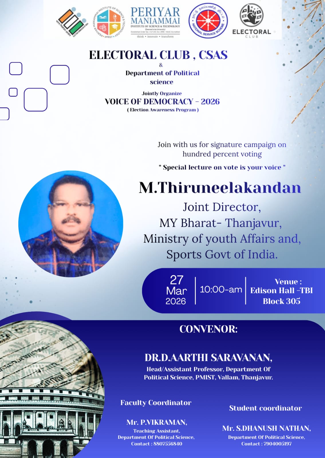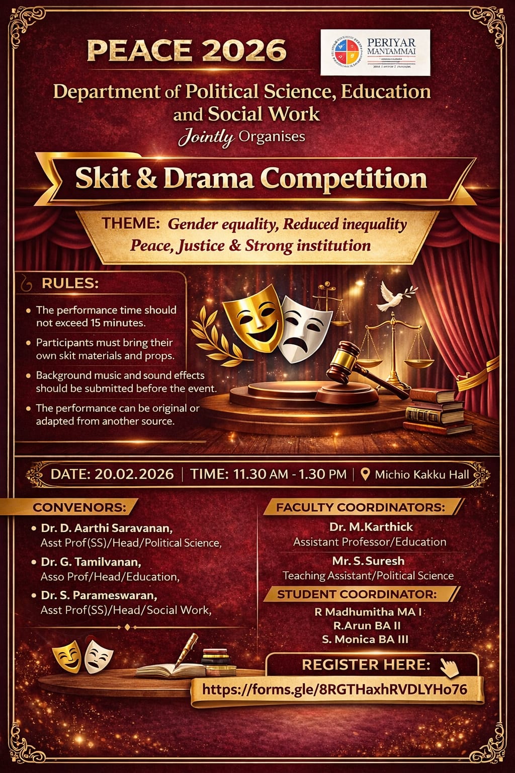 Department of Political Science, Periyar Maniammai Institute of Science & Technology (Deemed to be University), Thanjavur Organizing a Webinar on "National Education Policy 2020 - A Way Forward to Meet the Challenges" delivered by Prof. Prabhat Patnaik, Emeritus Professor, Department of Economic Studies and Planning, Jawaharlal Nehru University, New Delhi on 21.08.2020, 5.00Pm to 6.00 PM through Google Meet