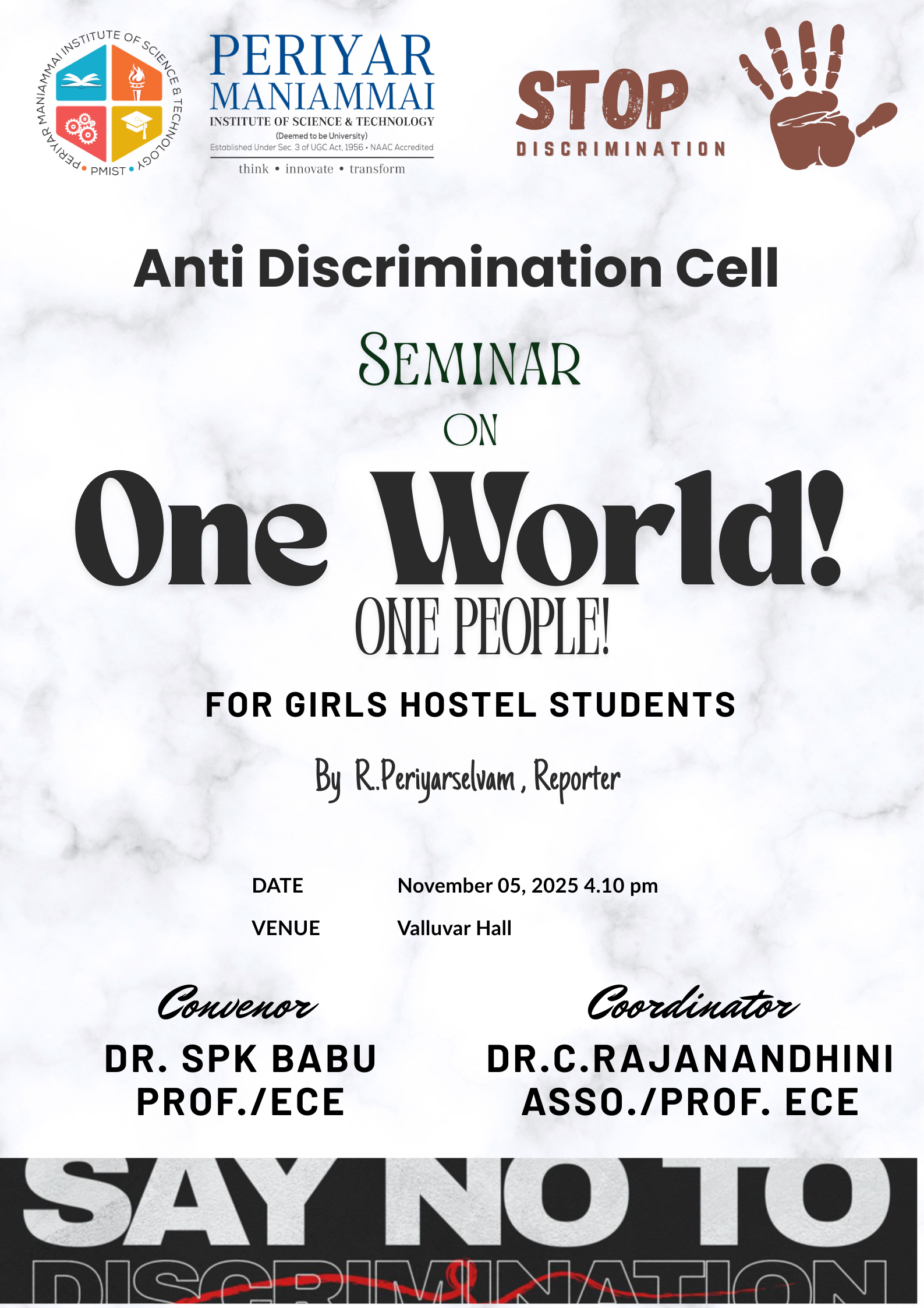 Anti Discrimination Cell SEMINAR ON One World! ONE PEOPLE! FOR GIRLS HOSTEL STUDENTS By R. Periyarselvam, Reporter