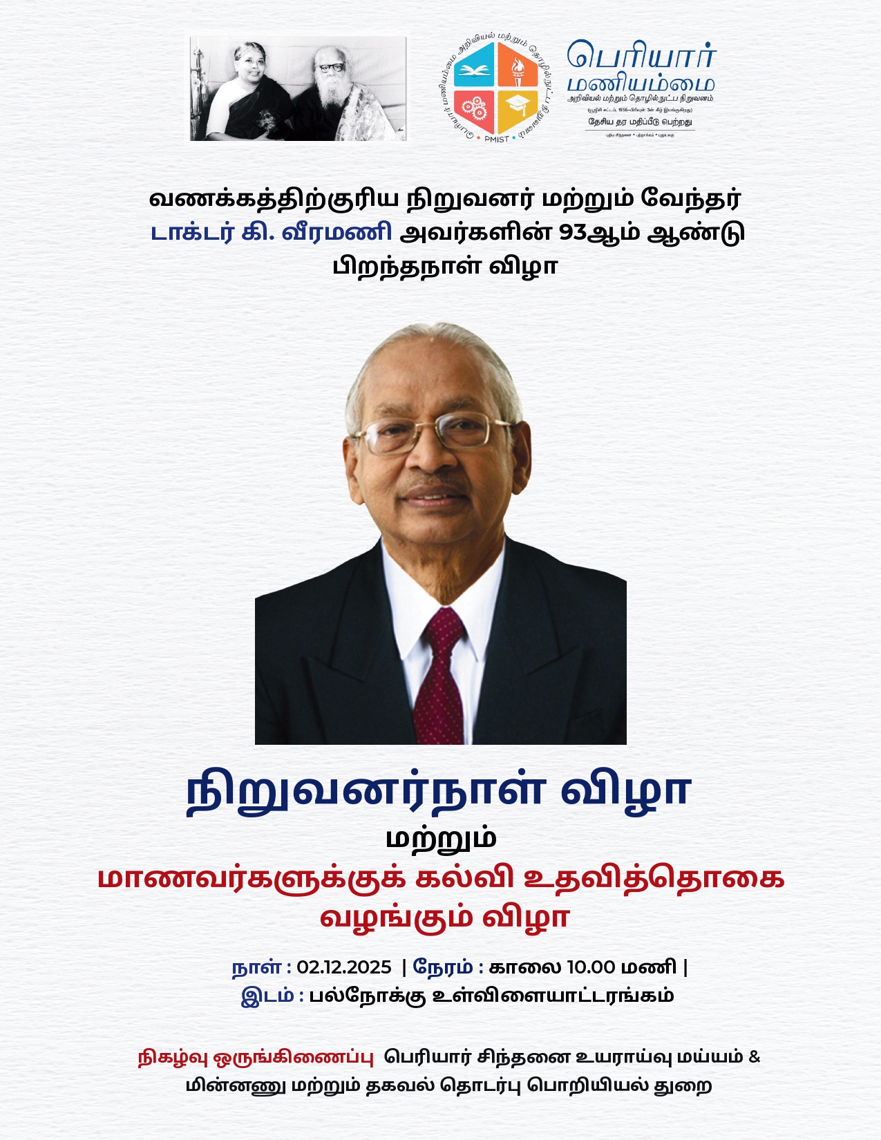 வணக்கத்திற்குரிய நிறுவனர் மற்றும் வேந்தர் டாக்டர் கி. வீரமணி அவர்களின் 93ஆம் ஆண்டு பிறந்தநாள் விழா நிறுவனர்நாள் விழா மற்றும் மாணவர்களுக்குக் கல்வி உதவித்தொகை வழங்கும் விழா.