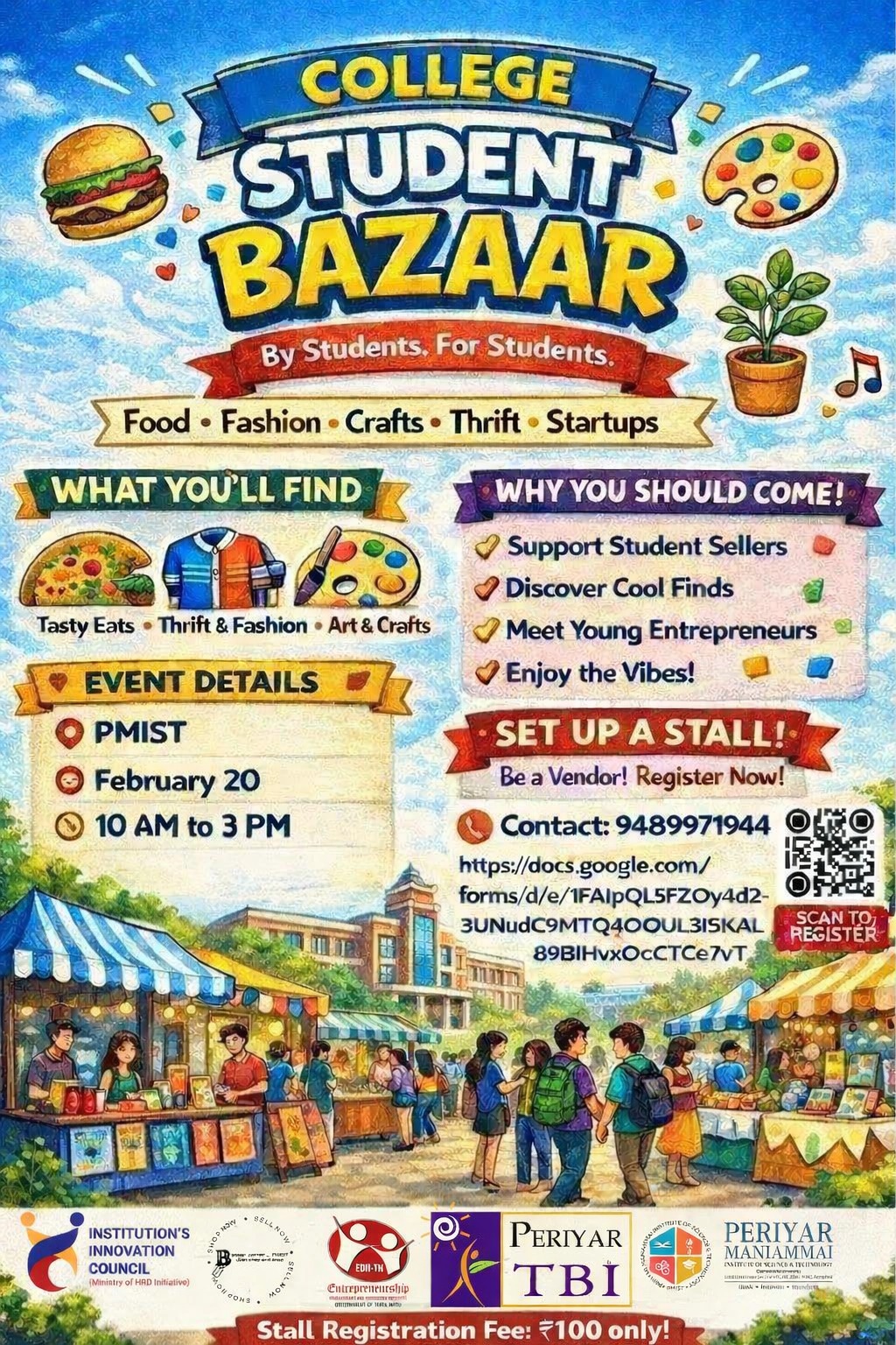 A student initiative of the E&I cell, the bazaar is happening on Feb 20, 2026, at the indoor stadium. 50+ stalls of different product ideas will be displayed for sale. This one exercise brought a light on how our students are earning on their own to support their financial needs. Please do visit their stalls and encourage them. In addition, your suggestions to improve the actions with higher objectives are encouraged.