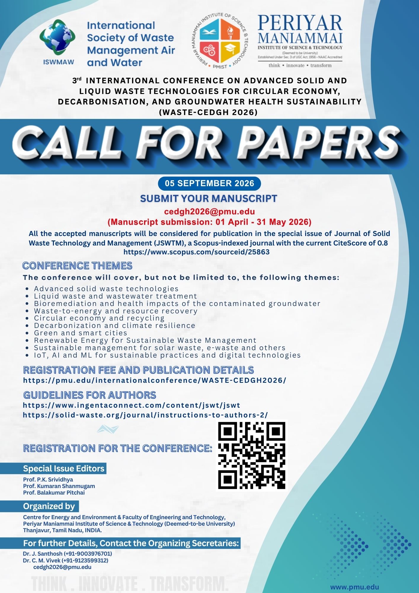 We are pleased to inform you that the Centre for Energy and Environment, in association with the Faculty of Engineering and Technology, PMIST, is organizing an International Conference on Advanced Solid and Liquid Waste Technologies for Circular Economy, Decarbonisation, and Groundwater Health Sustainability (WASTE-CEDGH 2026 on 05 September 2026.