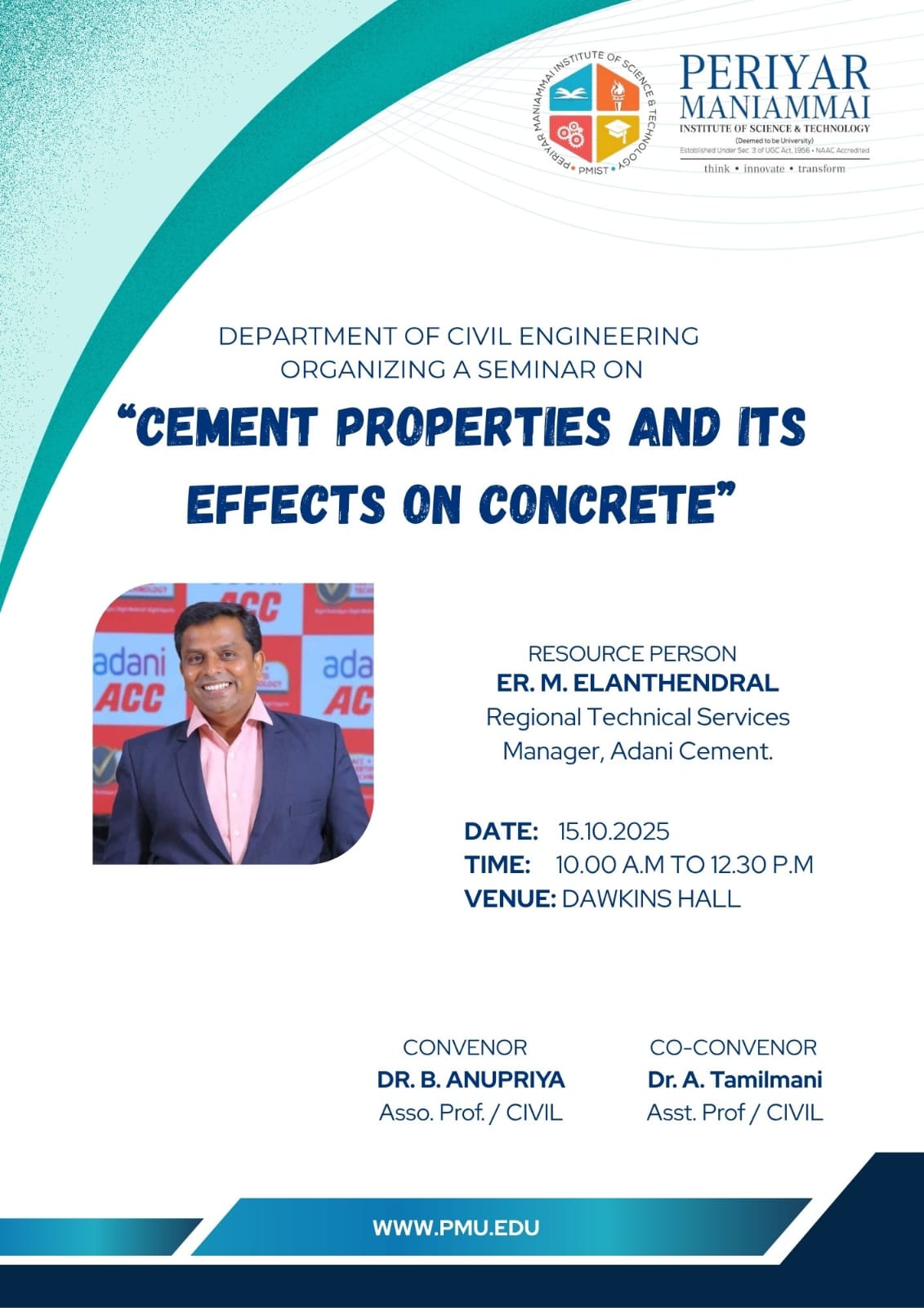 DEPARTMENT OF CIVIL ENGINEERING ORGANIZING A SEMINAR ON "CEMENT PROPERTIES AND ITS EFFECTS ON CONCRETE"
