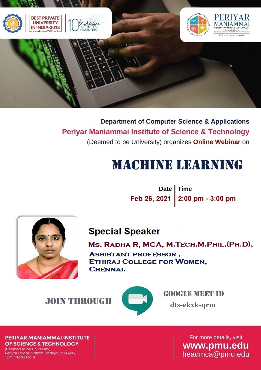 Department of Computer Science and Application, Periyar Maniammai Institute of Science & Technology (Deemed to be University), Thanjavur organizes Online Webinar on Machine Learning by Ms.R.Radha, Assistant Professor, Ethiraj College of Women, Chennai on 28.02.2021