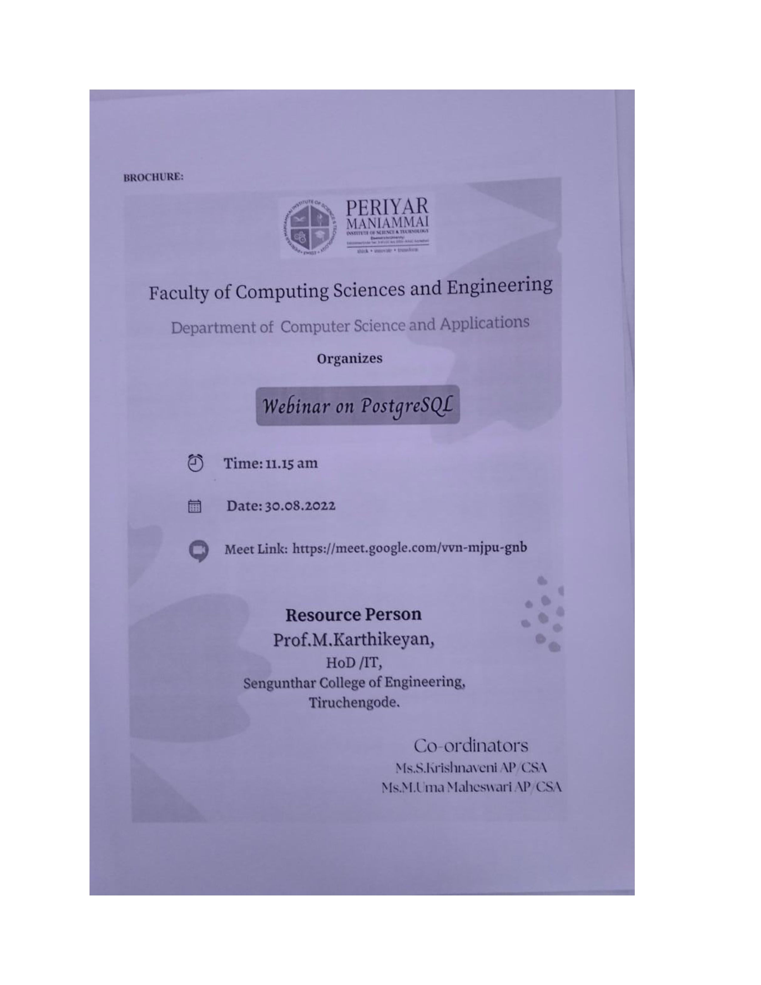 Department of Computer Science and Applications organizes a Webinar on "PostgreSQL" in Periyar Maniammai Institute of Science & Technology (Deemed to be University) on 30.08.2022