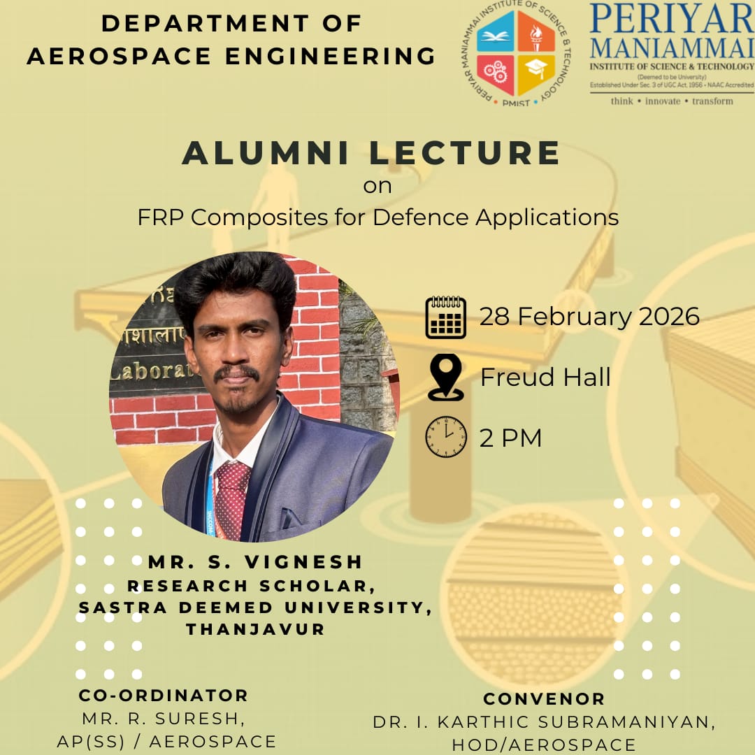 Department of Aerospace Engineering , Periyar Maniammai Institute of Science & Technology (Deemed to be University), Thanjavur , & Institution's Innovation Council Jointly organizes a webinar on Innovative Nano Materials used in Aerospace Applications Lecture given by Resource Person Dr.V.Sivamaran , Associate Professor , Department of Mechanical Engineering ,Audishankara College of Engineering and Technology , Nellore , Andhra Pradesh on 24.02.2022.
