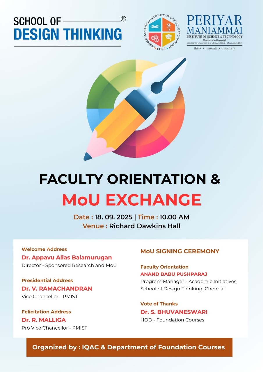 Periyar Maniammai Institute of Science and Technology (PMIST), Vallam, has signed a three-year Memorandum of Understanding (MoU) with the School of Design Thinking, Chennai under the Academia NxT™ initiative.