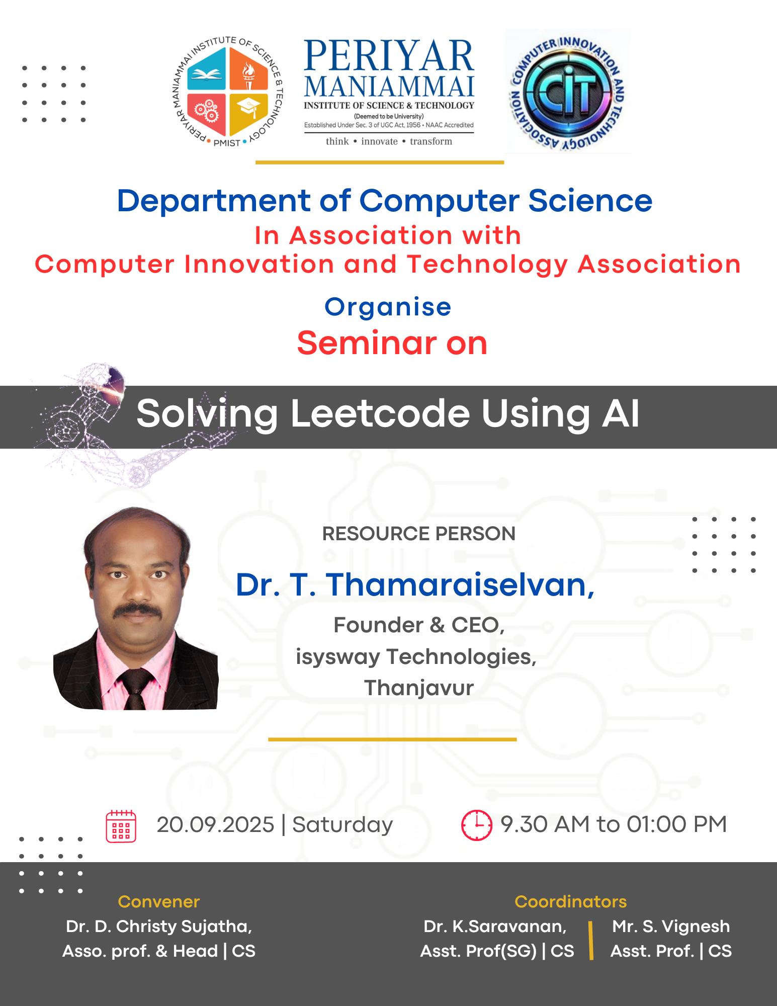 Department of Computer Science In Association with Computer Innovation and Technology Association Organise Seminar on Solving Leetcode Using Al