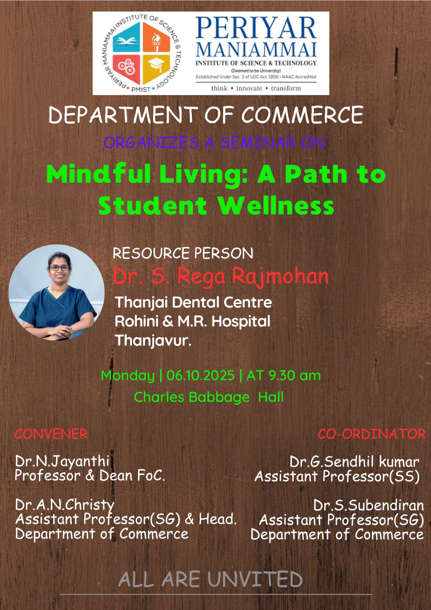 ORGANIZES A SEMINAR ON MINDFUL LIVING: A PATH TO STUDENT WELLNESS Dr. S. Rega Rajmohan Thanjai Dental Centre Rohini & M.R. Hospital Thanjavur