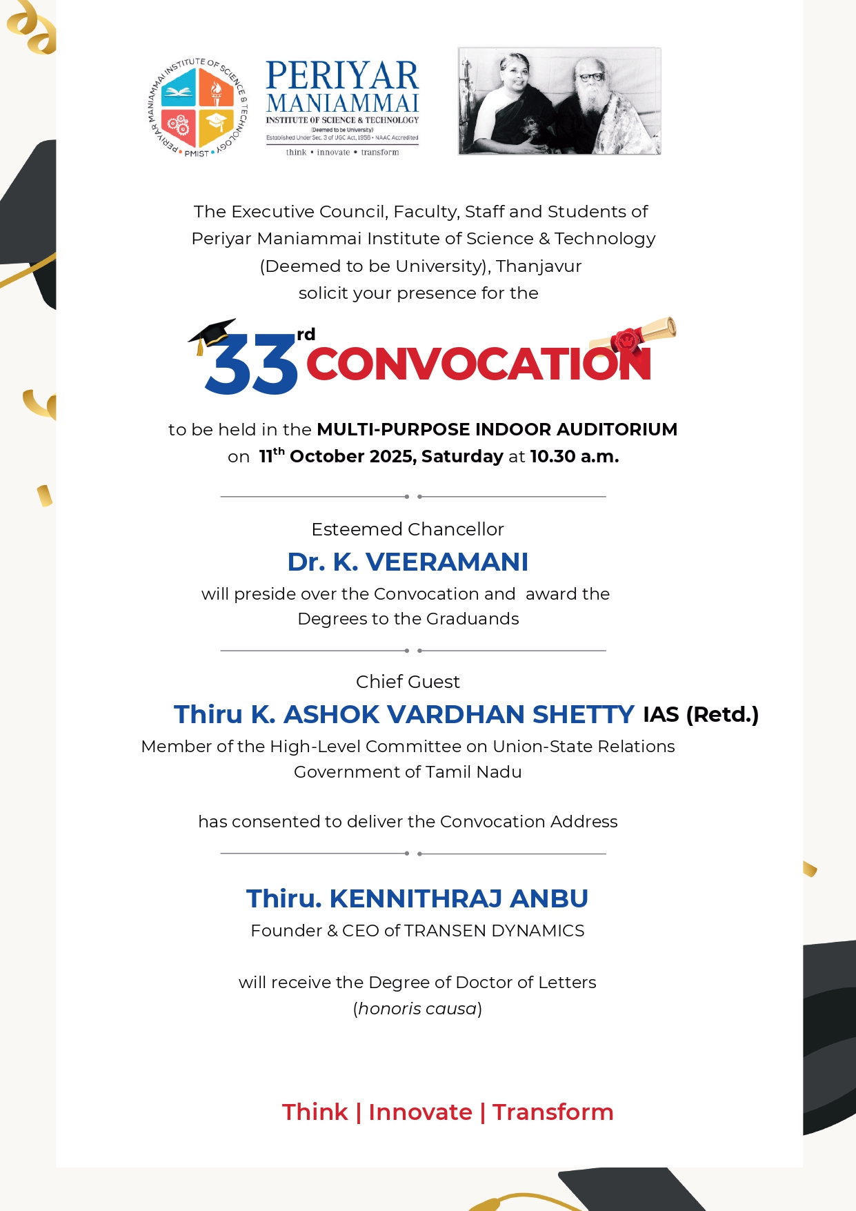 The Executive Council, Faculty, Staff and Students of Periyar Maniammai Institute of Science & Technology (Deemed to be University), Thanjavur. solicit your presence for the 33rd CONVOCATION to be held in the MULTI-PURPOSE INDOOR AUDITORIUM