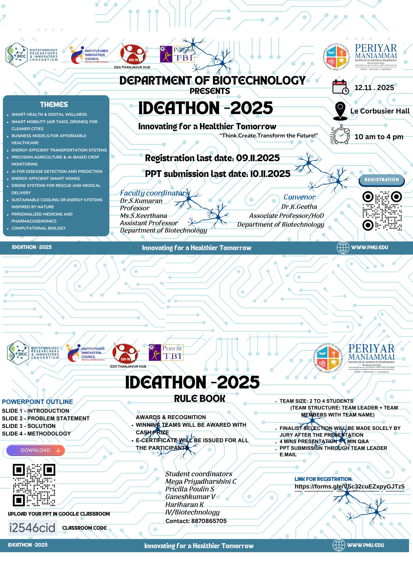 The Department of Biotechnology warmly invites Students to participate in Ideathon 2025 on 12th november 2025, an exciting platform to showcase the creativity, innovation, and problem-solving skills