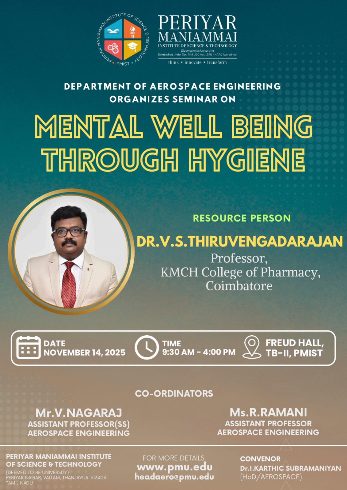 DEPARTMENT OF AEROSPACE ENGINEERING ORGANIZES SEMINAR ON MENTAL WELL BEING THROUGH HYGIENE RESOURCE PERSON DR.V.S.THIRUVENGADARAJAN Professor, KMCH College of Pharmacy, Coimbatore