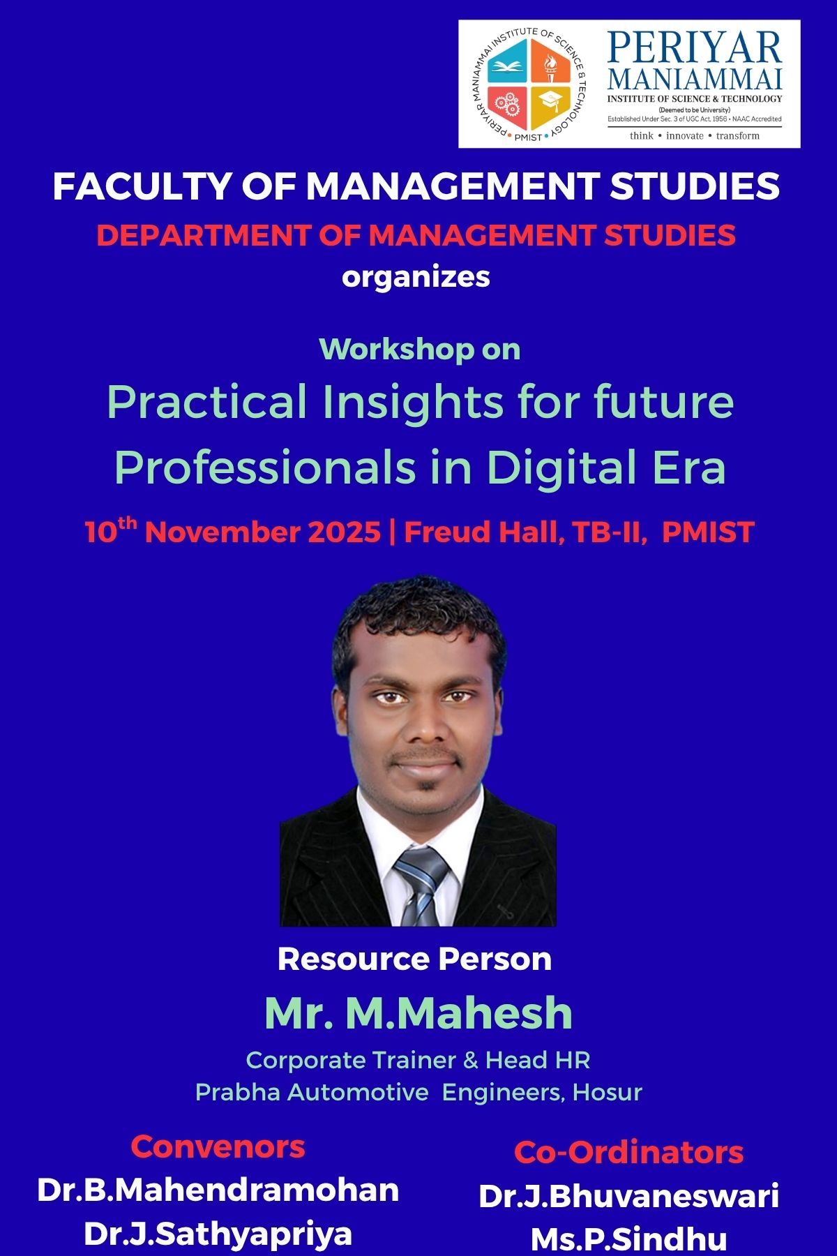 FACULTY OF MANAGEMENT STUDIES DEPARTMENT OF MANAGEMENT STUDIES organizes Workshop on Practical Insights for future Professionals in Digital Era