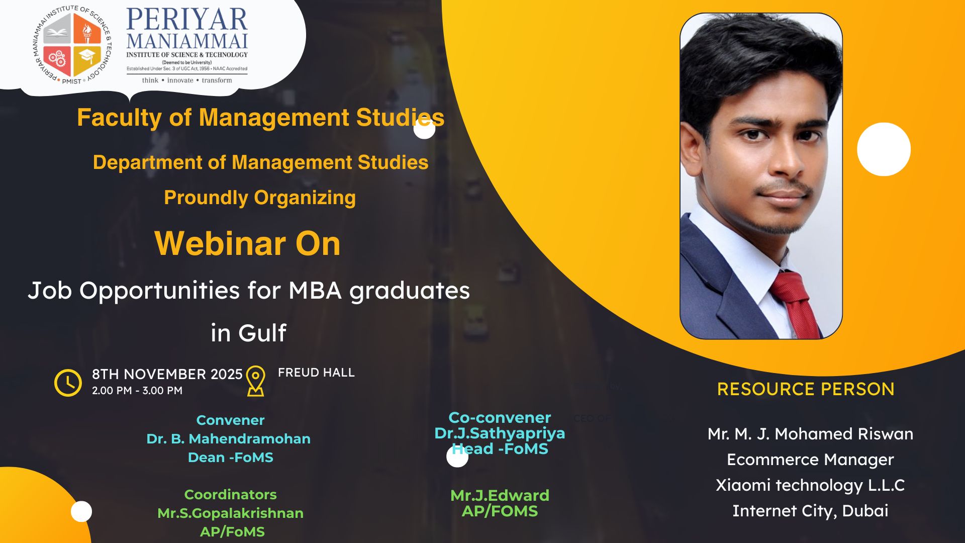 Faculty of Management Studies Department of Management Studies Proundly Organizing Webinar On Job Opportunities for MBA graduates in Gulf