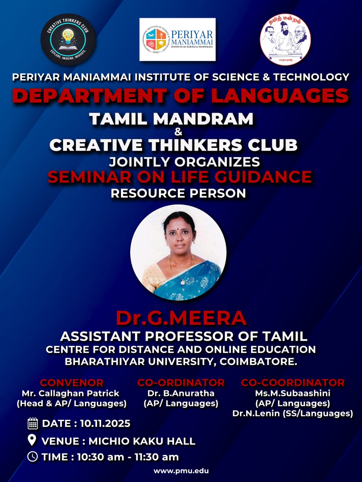 DEPARTMENT OF LANGUAGES TAMIL MANDRAM & CREATIVE THINKERS CLUB JOINTLY ORGANIZES SEMINAR ON LIFE GUIDANCE RESOURCE PERSON