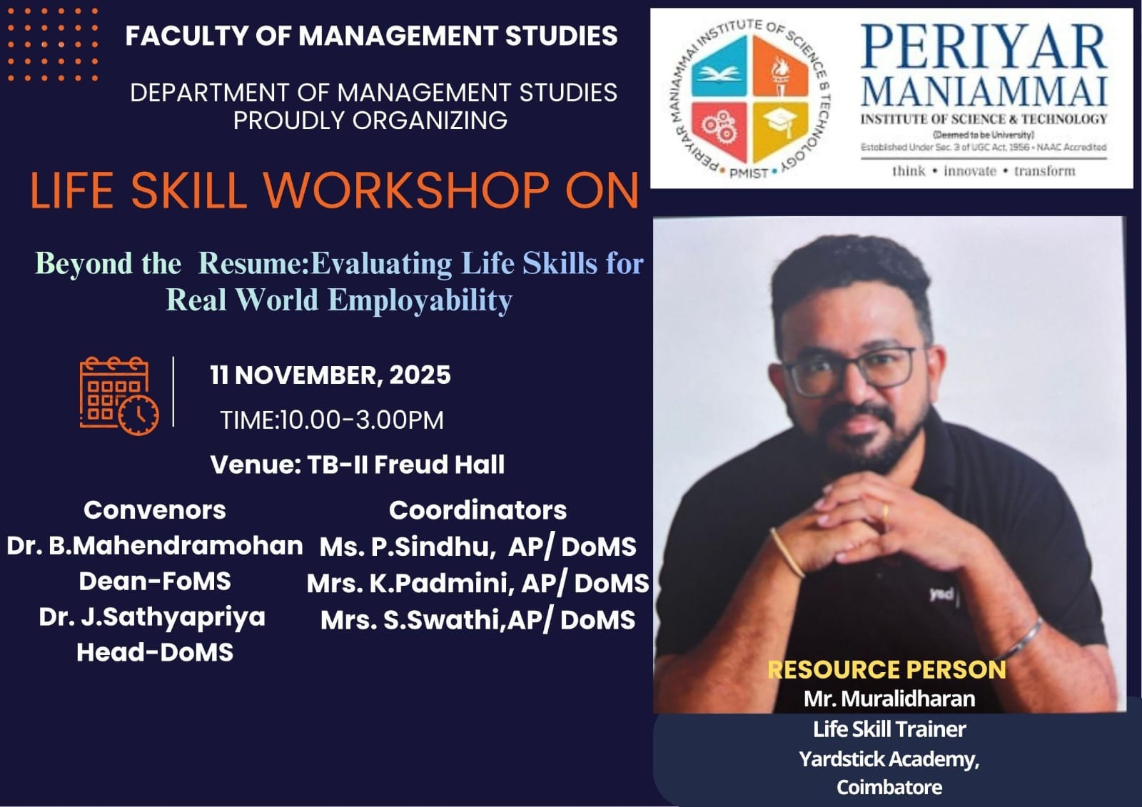 DEPARTMENT OF MANAGEMENT STUDIES PROUDLY ORGANIZING LIFE SKILL WORKSHOP ON Beyond the Resume: Evaluating Life Skills for Real-World Employability