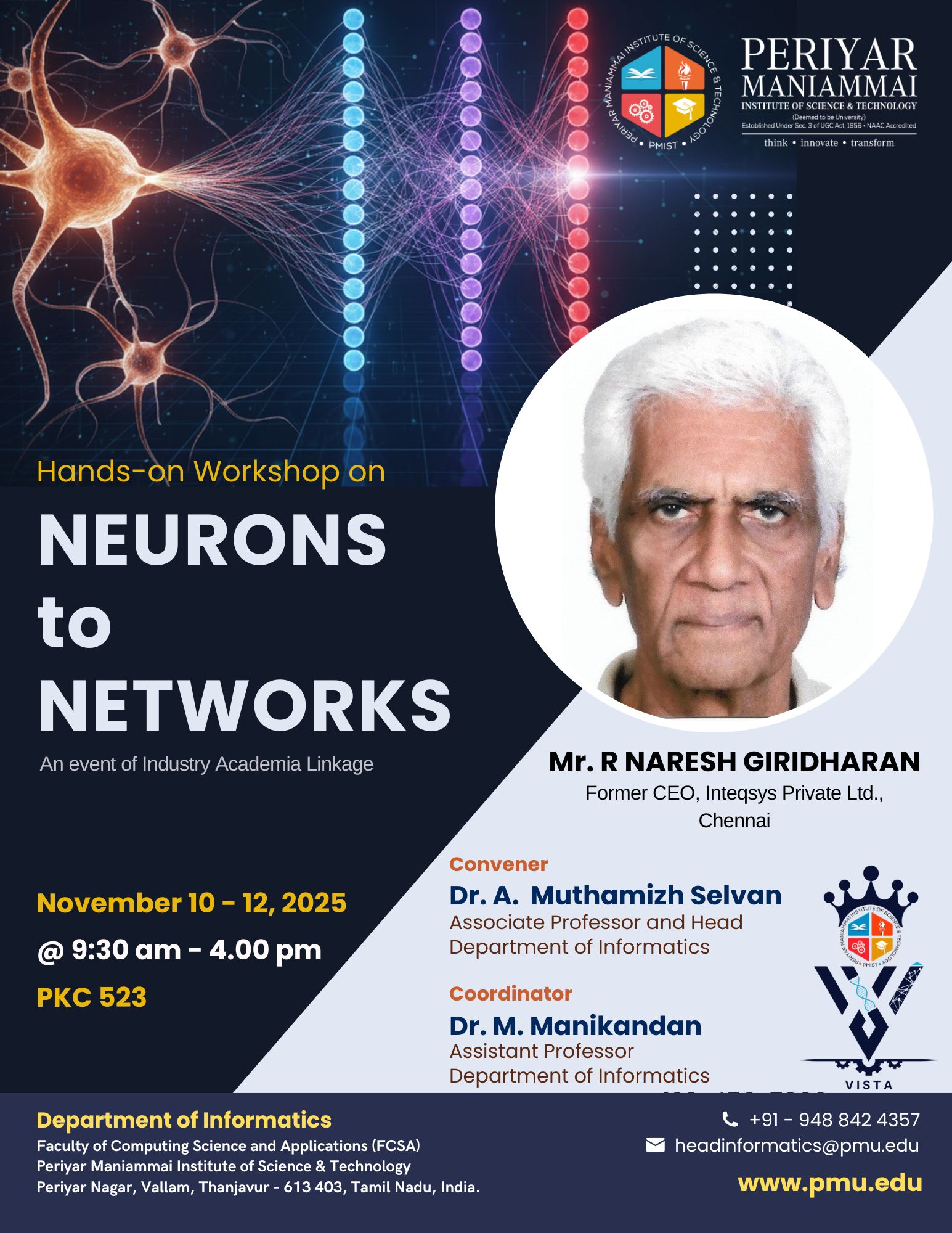 Hands-on Workshop on NEURONS to NETWORKS Mr. R NARESH GIRIDHARAN Former CEO, Inteqsys Private Ltd., Chennai