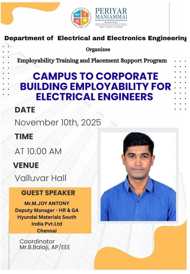 The Department of Electrical and Electronics Engineering organized an Employability Training and Placement Support Program titled “Campus to Corporate – Building Employability for Electrical Engineers.” The session was conducted by Mr. Joy Antony, Deputy Manager – HR & GA, Hyundai Motors India Private Limited, Chennai. The program aimed to bridge the gap between academic learning and industry expectations by equipping students with essential skills required for corporate success.