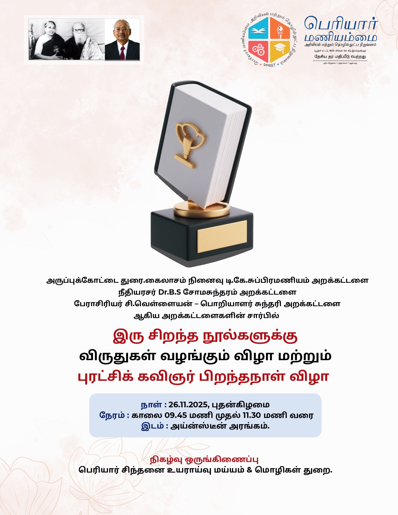 இரு சிறந்த நூல்களுக்கு விருதுகள் வழங்கும் விழா மற்றும் புரட்சிக் கவிஞர் பிறந்தநாள் விழா அருப்புக்கோட்டை துரை.கைலாசம் நினைவு டி.கே.சுப்பிரமணியம் அறக்கட்டளை நீதியரசர் Dr.B.S சோமசுந்தரம் அறக்கட்டளை பேராசிரியர் சி.வெள்ளையன் - பொறியாளர் சுந்தரி அறக்கட்டளை ஆகிய அறக்கட்டளைகளின் சார்பில் இரு சிறந்த நூல்களுக்கு விருதுகள் வழங்கும் விழா மற்றும் புரட்சிக் கவிஞர் பிறந்தநாள் விழா நாள் : 26.11.2025, புதன்கிழமை நேரம் : காலை 09.45 மணி முதல் 11.30 மணி வரை இடம் : அய்ன்ஸ்டீன் அரங்கம். நிகழ்வு ஒருங்கிணைப்பு பெரியார் சிந்தனை உயராய்வு மய்யம் & மொழிகள் துறை