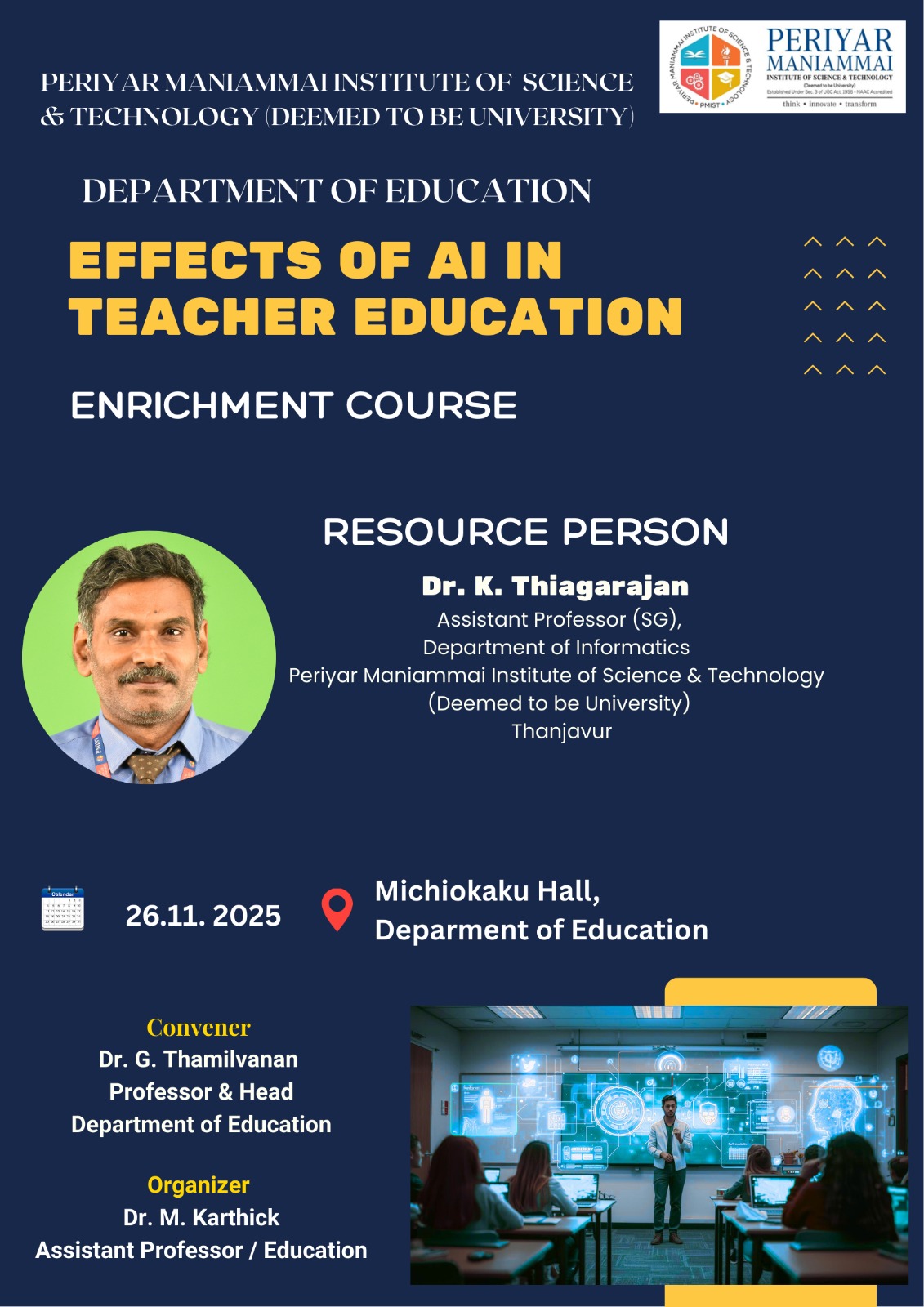 AI in Teacher Education on 26.11.2025 in Michiokaku Hall. Dr G. Thamilvanan, Prof. and Head felicitated the programme. Dr M. Karthick, Asst Prof. of the department, introduced the guest. Dr K. Thiagarajan, Asst Prof (SG), Department of Informatics, PMIST, delivered a special address on the Effects of AI in Teacher Education. The II B.Sc.B.Ed students V. Akila welcomed the gathering, and V. Yuvashree proposed a vote of thanks in this programme.