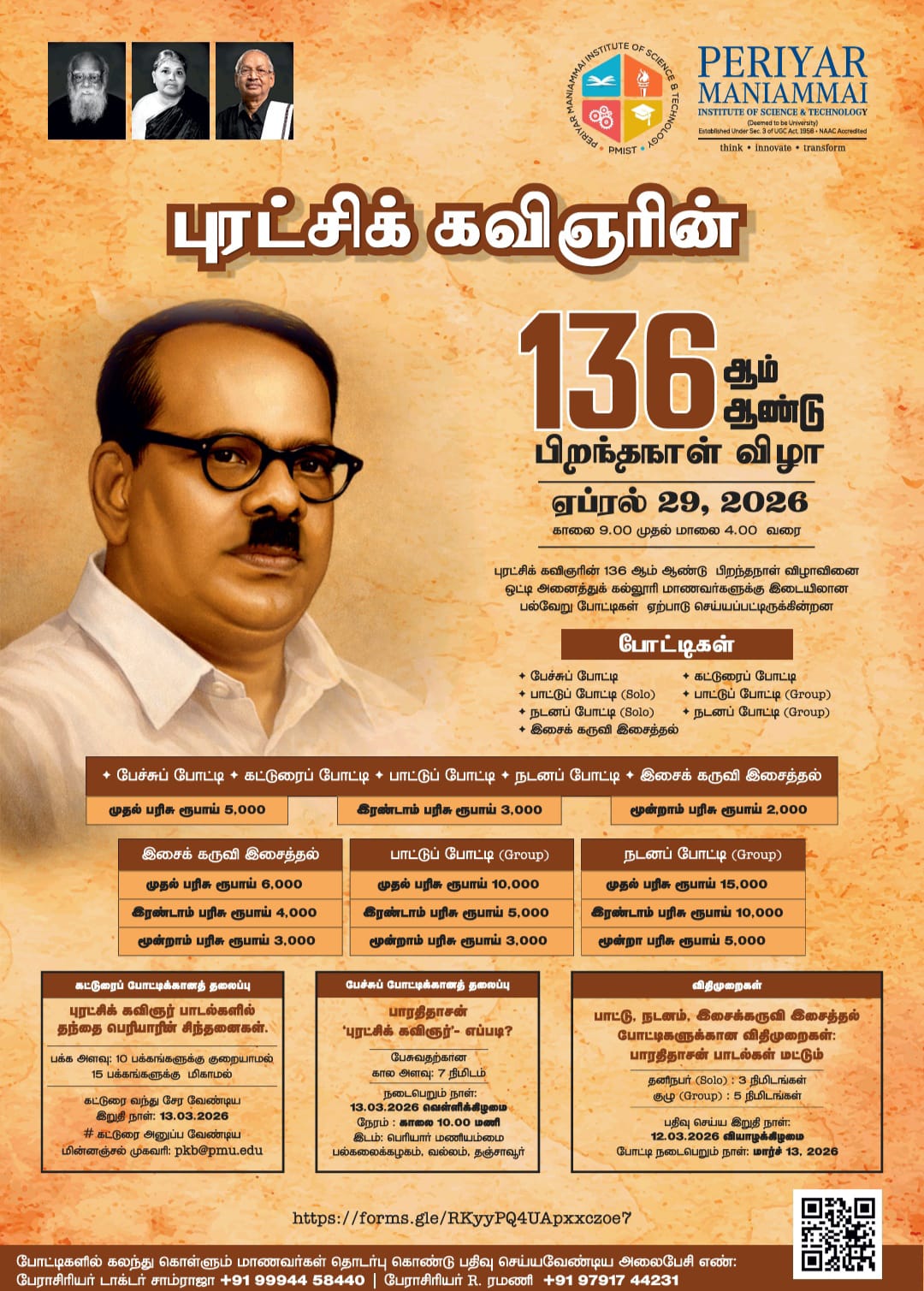 புரட்சிக் கவிஞரின் 136 ஆம் ஆண்டு பிறந்தநாள் விழாவினை ஒட்டி அனைத்துக் கல்லூரி மாணவர்களுக்கு இடையிலான பல்வேறு போட்டிகள் ஏற்பாடு செய்யப்பட்டிருக்கின்றன